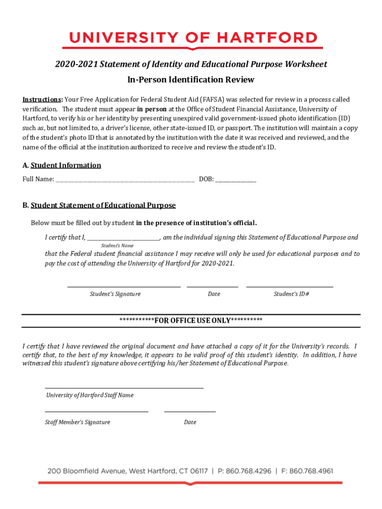 20202021 Statement of Identity and Educational Purpose Worksheet Unperson Identification Review Instructions: Your Free Application for Federal Student Aid (FAFSA) was selected for review in a process
