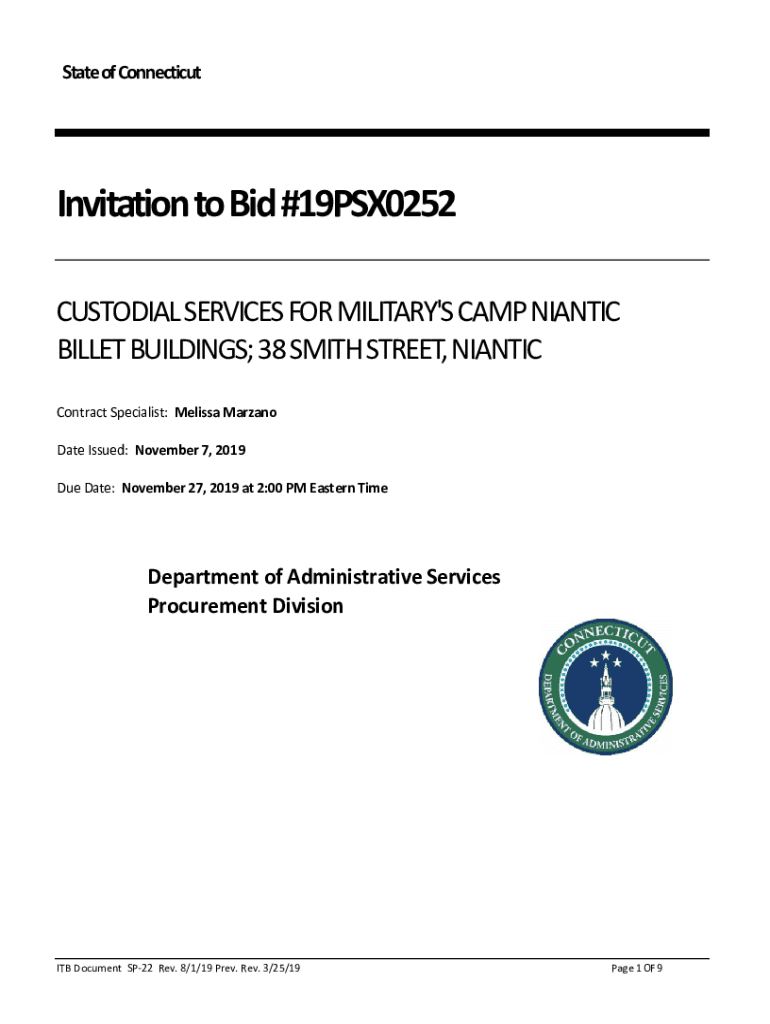 State of ConnecticutInvitation to Bid #19PSX0252 CUSTODIAL SERVICES FOR MILITARY\'S CAMP GIGANTIC BILLET BUILDINGS; 38 SMITH STREET, GIGANTIC Contract Specialist: Melissa Mariano Date Issued: November