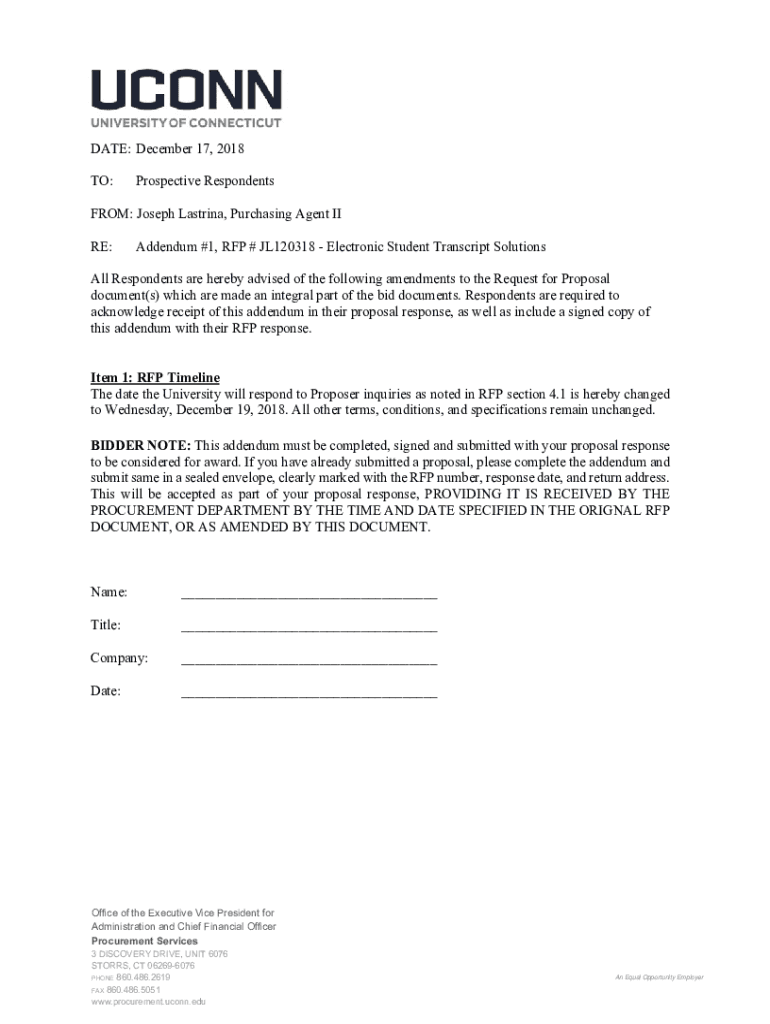 RE:Addendum #1, RFP # JL120318 Electronic Student Transcript Solutions Respondents are hereby advised of