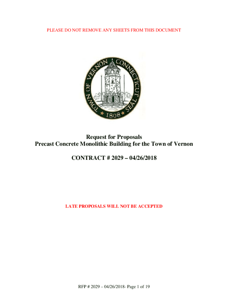 PLEASE DO NOT REMOVE ANY SHEETS FROM THIS DOCUMENTRequest for Proposals Precast Concrete Monolithic Building for the Town of Vernon CONTRACT # 2029 04/26/2018LATE PROPOSALS WILL NOT BE ACCEPTED RFP