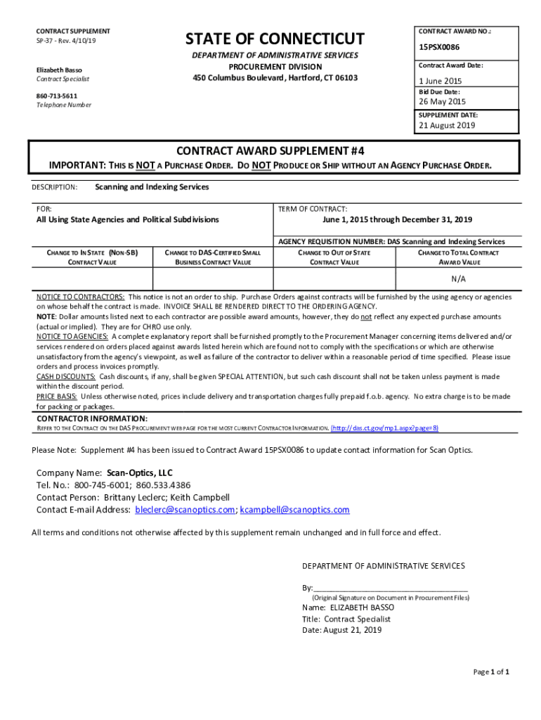 CONTRACT SUPPLEMENT SP37 Rev. 4/10/19STATE OF CONNECTICUT DEPARTMENT OF ADMINISTRATIVE SERVICES PROCUREMENT DIVISION 450 Columbus Boulevard, Hartford, CT 06103Elizabeth Basso Contract SpecialistCONTRACT