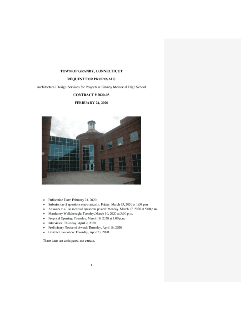 TOWN OF GRANBY, CONNECTICUT REQUEST FOR PROPOSALS Architectural Design Services for Projects at Granby Memorial High School CONTRACT # 202003 FEBRUARY 24, 2020, Publication Date: February 24, 2020.