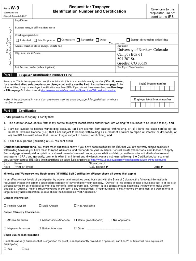 FormRequest for Taxpayer Identification Number and CertificationW9Substitute Forgive form to the requester. Do not send to the IRS. State of Colorado 82007Print or Typeset Specific Instructions on