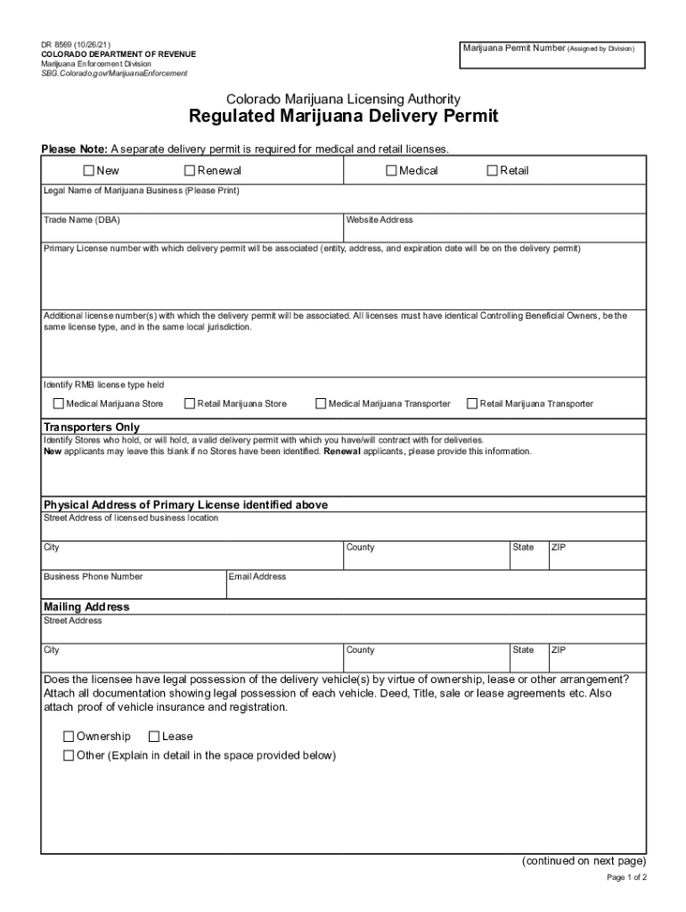 DR 8569 (10/26/21) COLORADO DEPARTMENT OF REVENUE Marijuana Enforcement Division SBG.Colorado.gov/MarijuanaEnforcementMarijuana Permit Number (Assigned by Division)Colorado Marijuana Licensing AuthorityRegulated