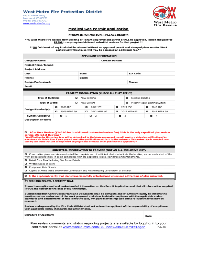 West Metro Fire Protection District 433 S. Allison Pkwy. Lakewood, CO 80226 Phone: 303.989.4307 www.westmetrofire.orgMedical Gas Permit Application **NEW INFORMATION PLEASE READ** **A West Metro Fire
