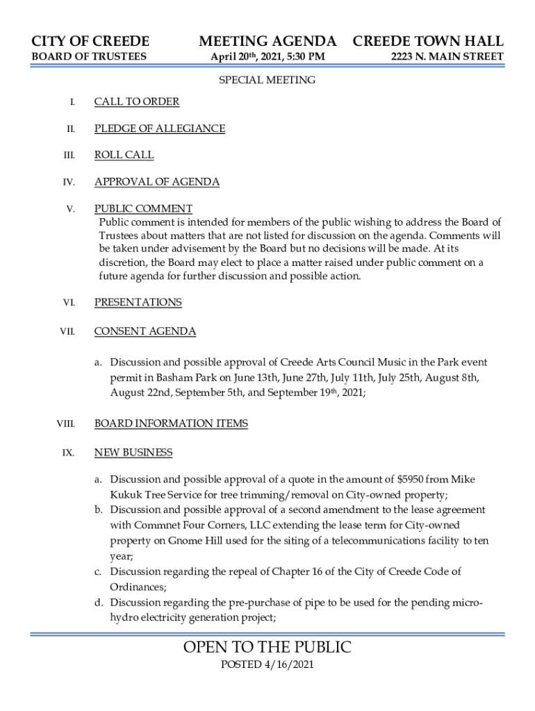 CITY OF CREEDEMEETING AGENDABOARD OF TRUSTEESApril20th,2021, 5:30 DECREED TOWN HALL