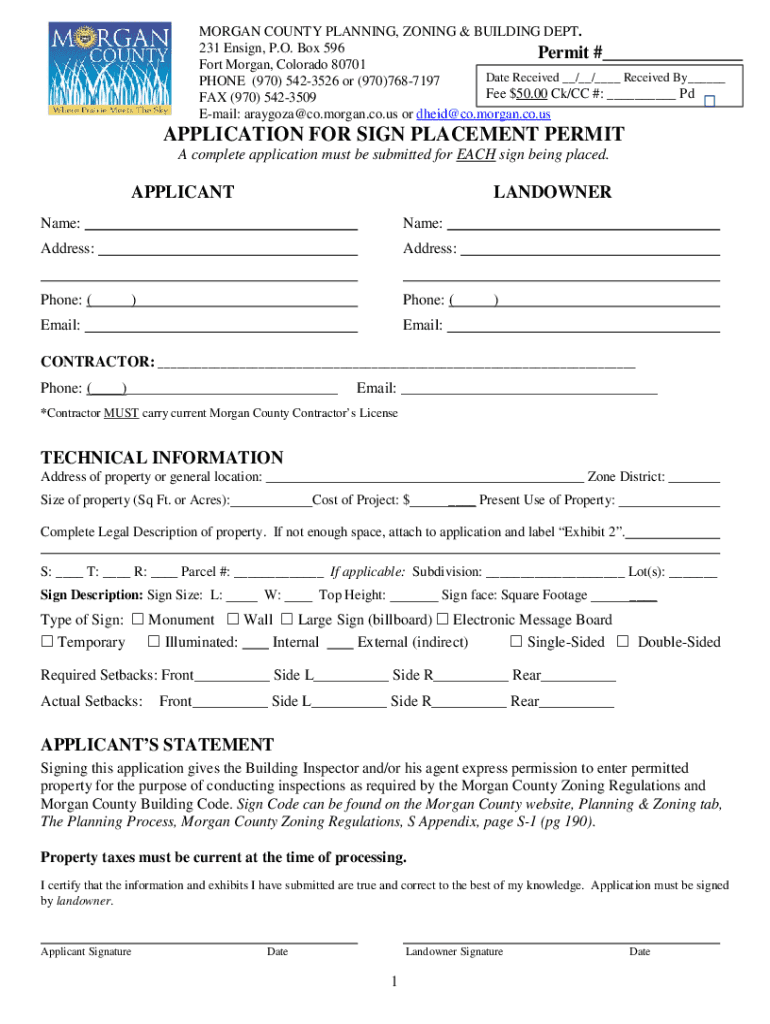 MORGAN COUNTY PLANNING, ZONING & BUILDING DEPT. 231 Ensign, P.O. Box 596 Permit # Fort Morgan, Colorado 80701 Date Received __/__/___ Received By___ PHONE (970) 5423526 or (970)7687197 Fee $50.00