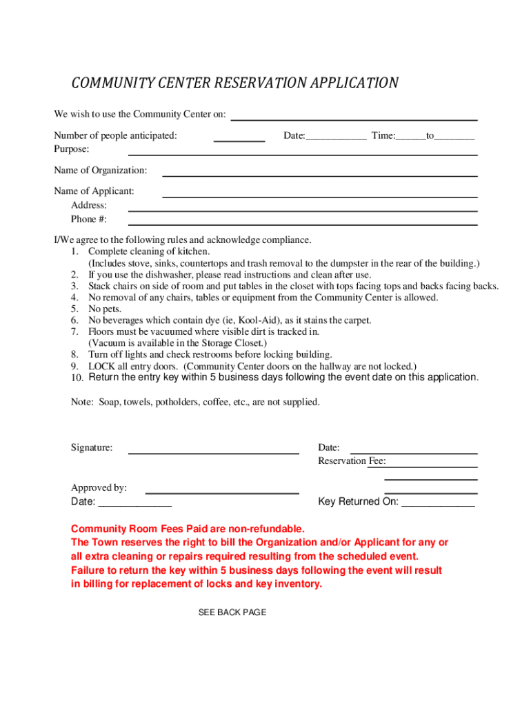 COMMUNITY CENTER RESERVATION APPLICATION We wish to use the Community Center on: Number of people anticipated: Purpose:Date:___ Time:___to___Name of Organization: Name of Applicant: Address: Phone
