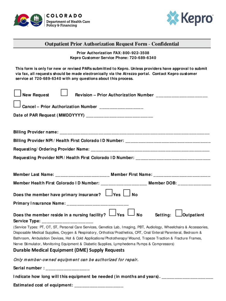 Outpatient Prior Authorization Request Form Confidential Prior Authorization FAX: 8009223508 Kept Customer Service Phone: 7206896340 This form is only for new or revised Pars submitted to Keep. Unless