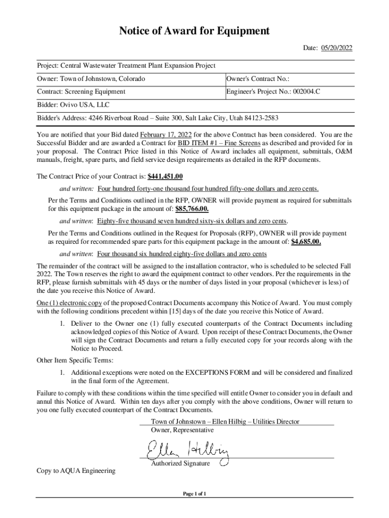 Owner: Town of Johnstown, ColoradoOwner\'s Contract No.:Contract: Screening EquipmentEngineer\'s