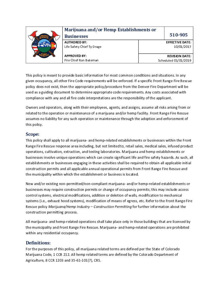Marijuana and/or Hemp Establishments or Businesses AUTHORED BY: Life Safety Chief Ty Drag APPROVED BY: Fire Chief Ron Bateman510905 EFFECTIVE DATE: 10/01/2017 REVISION DATE: Scheduled 01/01/2019This