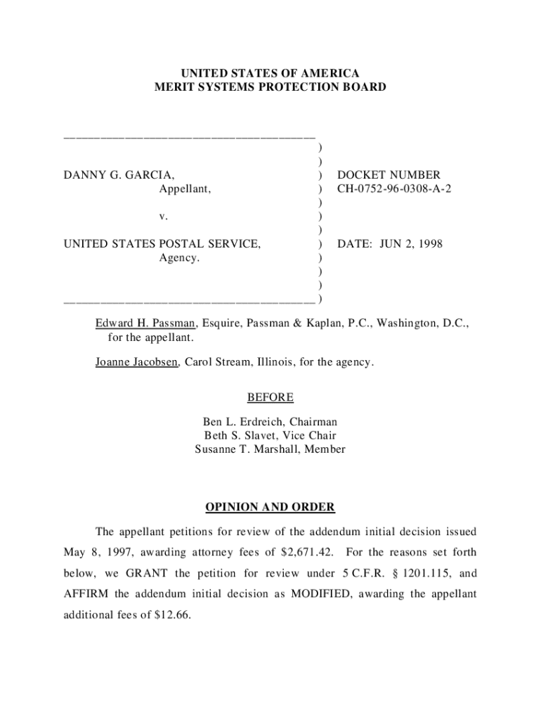 UNITED STATES OF AMERICA MERIT SYSTEMS PROTECTION BOARD___)) DANNY G. GARCIA, ) Appellant, ) ) v.) ) UNITED STATES POSTAL SERVICE, ) Agency. ))) ___)DOCKET NUMBER CH0752960308A2DATE: JUN 2, 1998Edward