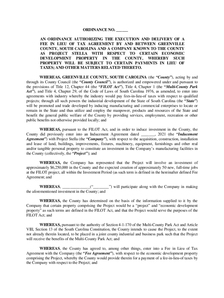 ORDINANCE NO. ___ AN ORDINANCE AUTHORIZING THE EXECUTION AND DELIVERY OF A FEE IN LIEU OF TAX AGREEMENT BY AND BETWEEN GREENVILLE COUNTY, SOUTH CAROLINA AND A COMPANY KNOWN TO THE COUNTY AS PROJECT
