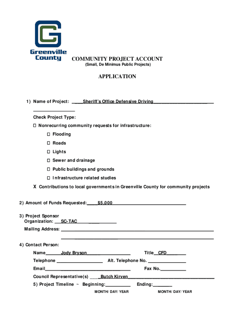 COMMUNITY PROJECT ACCOUNT (Small, De Minimum Public Projects)APPLICATION1) Name of Project:___Sheriffs Office Defensive Driving___Check Project Type: Nonrecurring community requests for infrastructure: