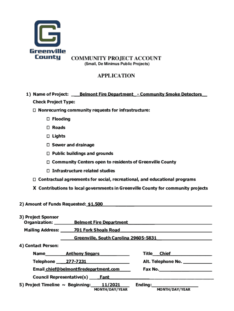 COMMUNITY PROJECT ACCOUNT (Small, De Minimum Public Projects)APPLICATION 1) Name of Project:__Belmont Fire Department_ Community Smoke Detectors__Check Project Type: Nonrecurring community requests