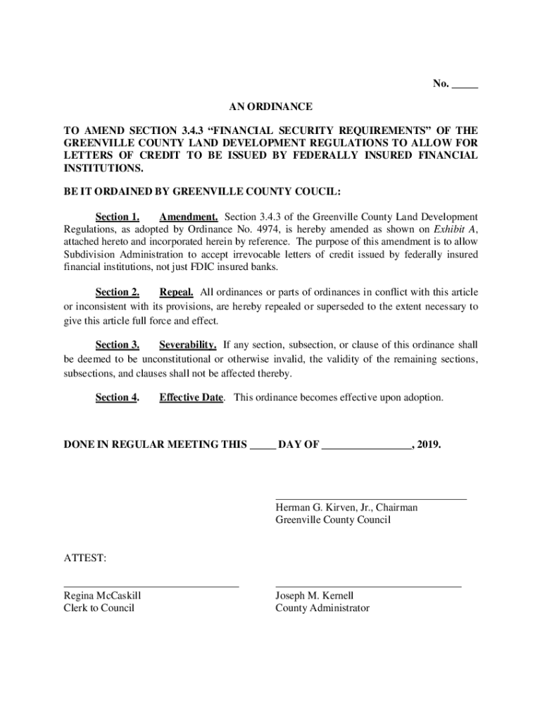 No. ___ AN ORDINANCE TO AMEND SECTION 3.4.3 FINANCIAL SECURITY REQUIREMENTS OF THE GREENVILLE COUNTY LAND DEVELOPMENT REGULATIONS TO ALLOW FOR LETTERS OF CREDIT TO BE ISSUED BY FEDERALLY INSURED FINANCIAL
