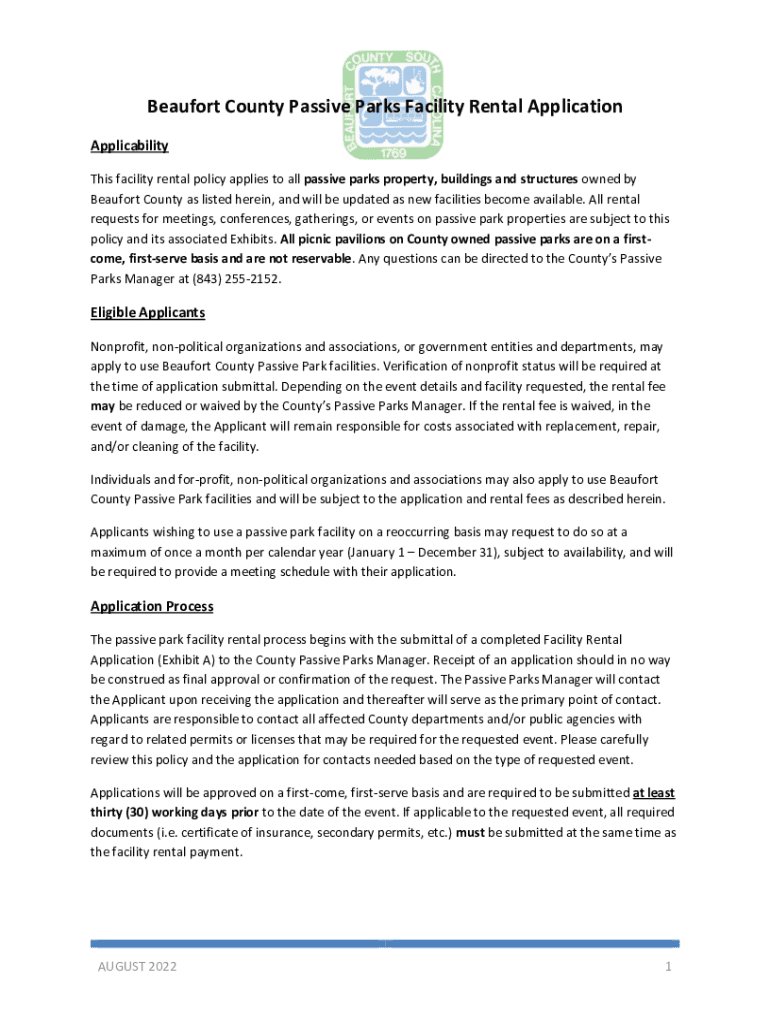 Beaufort County Passive Parks Facility Rental Application Applicability This facility rental policy applies to all passive parks property, buildings and structures owned by Beaufort County as listed