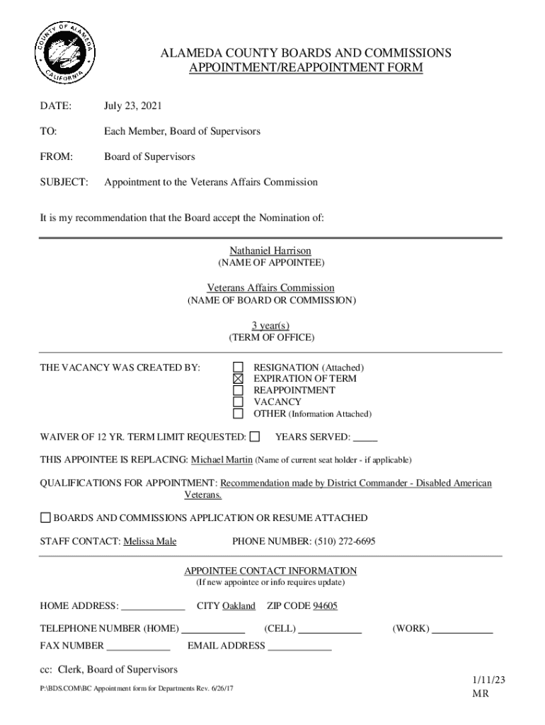 ALAMEDA COUNTY BOARDS AND COMMISSIONS APPOINTMENT/REAPPOINTMENT FORM DATE:July 23, 2021TO:Each Member, Board of SupervisorsFROM:Board of SupervisorsSUBJECT:Appointment to the Veterans Affairs Commission