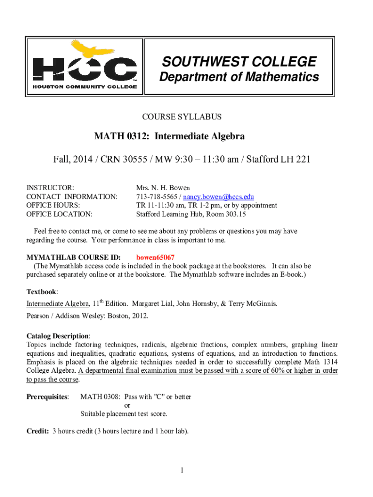 SOUTHWEST COLLEGE Department of Mathematics COURSE SYLLABUSMATH 0312: Intermediate Algebra Fall, 2014 / CRN 30555 / MW 9:30 11:30 am / Stafford LH 221 INSTRUCTOR: CONTACT INFORMATION: OFFICE HOURS: