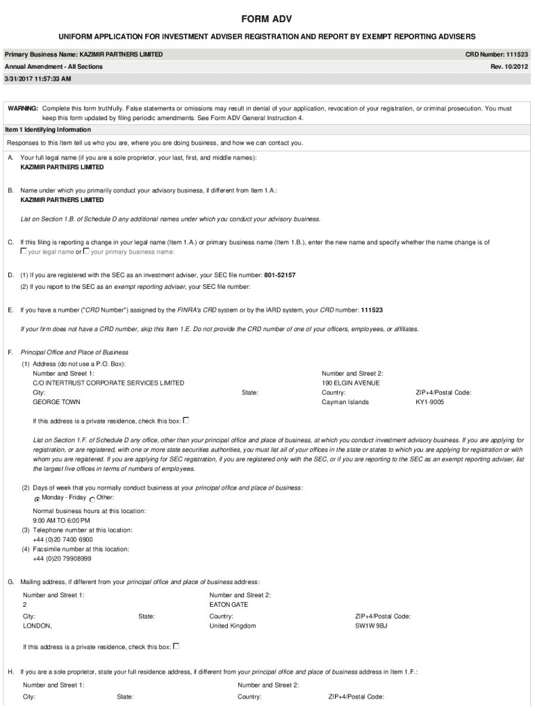 FORM ADV UNIFORM APPLICATION FOR INVESTMENT ADVISER REGISTRATION AND REPORT BY EXEMPT REPORTING ADVISERS Primary Business Name: KASHMIR PARTNERS LIMITED CRD Number: 111523Annual Amendment All Sections
