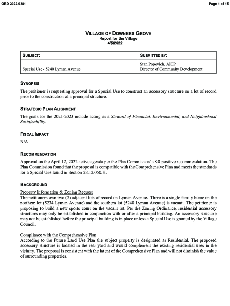 ORD 20229381Page 1 of 15VILLAGE OF DOWNERS GROVE Report for the Village 4/5/2022SUBJECT:SUBMITTED BY:Special Use 5240 Lyman Avenue Stan Pooch, ICP Director of Community DevelopmentSYNOPSIS The petitioner