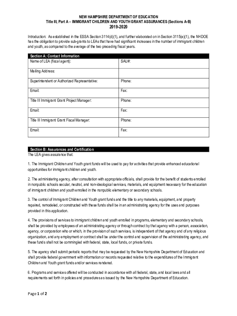NEW HAMPSHIRE DEPARTMENT OF EDUCATION Title III, Part A IMMIGRANT CHILDREN AND YOUTH GRANT ASSURANCES (Sections AB)20192020 Introduction: As established in the ESSAY Section 3114(d)(1), and further