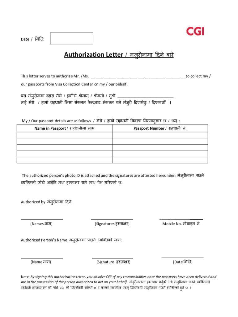 Date / :Authorization Letter / This letter serves to authorize Mr. /Ms. ___ to collect my / our passports from Visa Collection Center on my / our behalf. /, / / ___/ !\” %