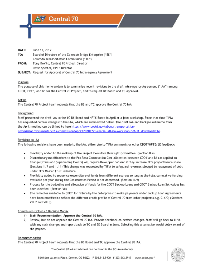DATE: TO:June 17, 2017, Board of Directors of the Colorado Bridge Enterprise (BE) Colorado Transportation Commission (TC) FROM: Tony DeVito, Central 70 Project Director David Spector, HATE Director