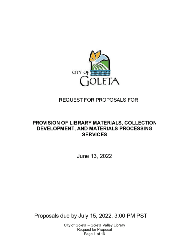REQUEST FOR PROPOSALS PROVISION OF LIBRARY MATERIALS, COLLECTION DEVELOPMENT, AND MATERIALS PROCESSING SERVICES June 13, 2022Proposals due by July 15, 2022, 3:00 PM PST City of Goleta Valley Library