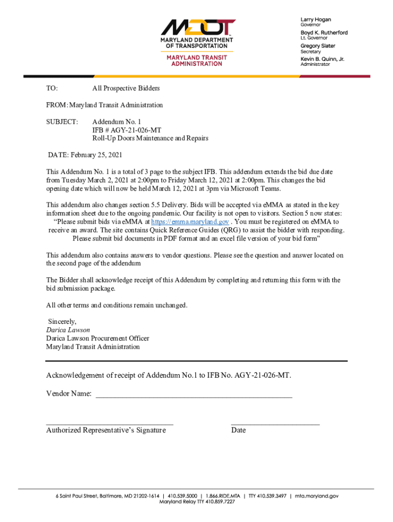 Get the free Acknowledgement of receipt of Addendum No.1 to IFB No ...
