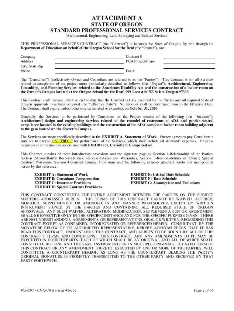 ATTACHMENT A STATE OF OREGON STANDARD PROFESSIONAL SERVICES CONTRACT (Architectural, Engineering, Land Surveying and Related Services) THIS PROFESSIONAL SERVICES CONTRACT (the Contract) is between