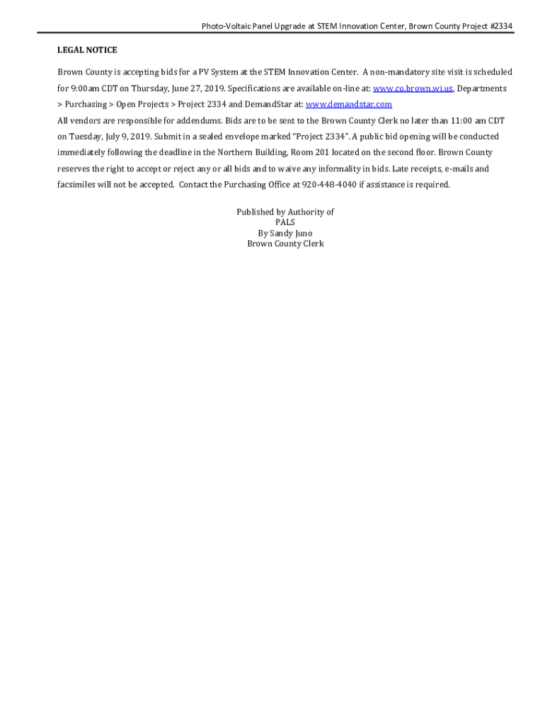 Photovoltaic Panel Upgrade at STEM Innovation Center, Brown County Project #2334 LEGAL NOTICE Brown County is accepting bids for a PV System at the STEM Innovation Center. A nonmandatory site visit
