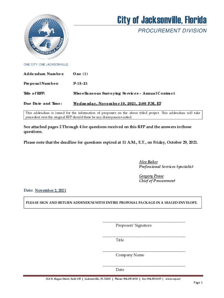 City of Jacksonville, Florida PROCUREMENT DIVISION ONE CITY. ONE JACKSONVILLE. Addendum Number:One (1)Proposal Number:P1521Title of RFP:Miscellaneous Surveying Services Annual Contractile Date and