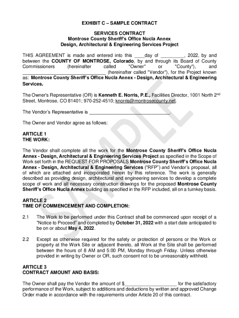 EXHIBIT C SAMPLE CONTRACT SERVICES CONTRACT Montrose County Sheriffs Office Nuclei Annex Design, Architectural & Engineering Services Project THIS AGREEMENT is made and entered into this ___day of