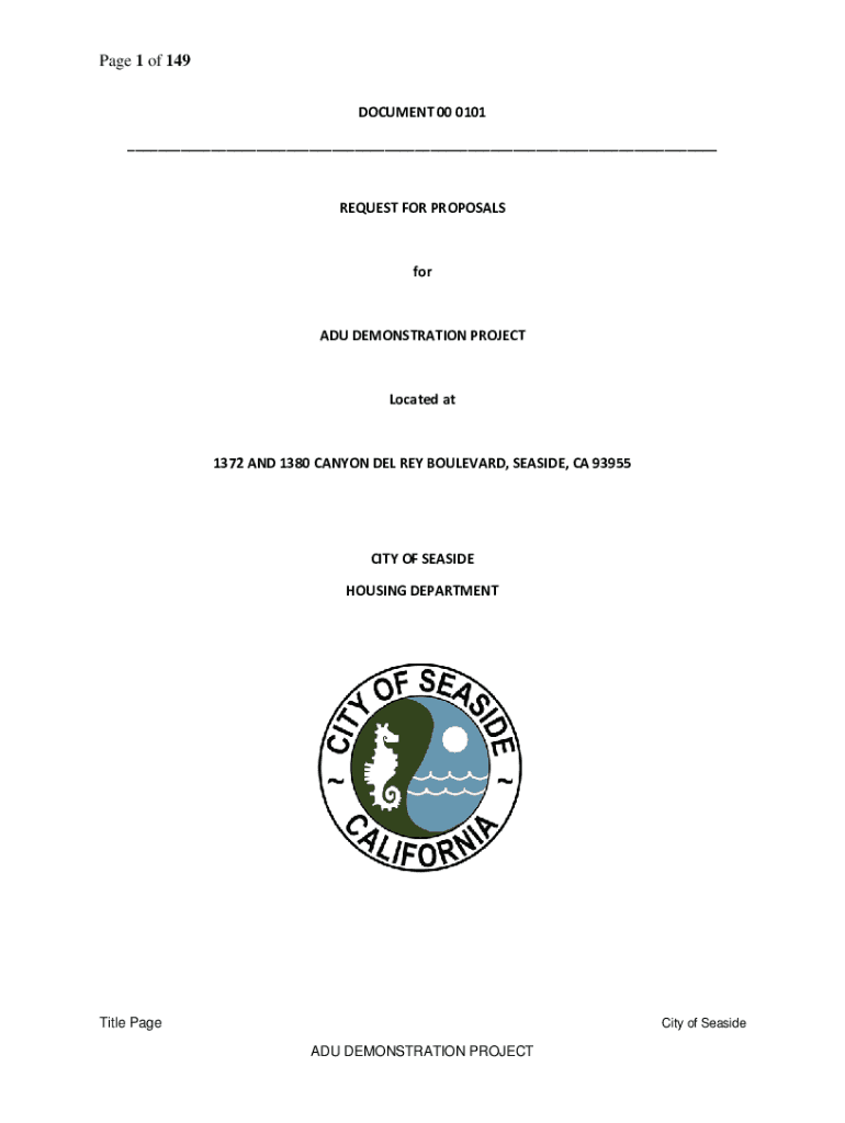Page 1 of 149 DOCUMENT 00 0101 ___REQUEST FOR PROPOSALSforADU DEMONSTRATION PROJECTLocated at1372 AND 1380 CANYON DEL REY BOULEVARD, SEASIDE, CA 93955CITY OF SEASIDE HOUSING DEPARTMENTTitle Paucity
