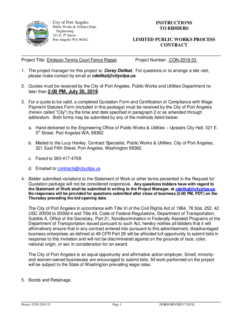 City of Port AngelesINSTRUCTIONS TO BIDDERSPublic Works & Utilities Dept. Engineering 321 E. 5th Street Port Angeles WA 98362LIMITED PUBLIC WORKS PROCESS CONTRACTProject Title: Erickson Tennis Court