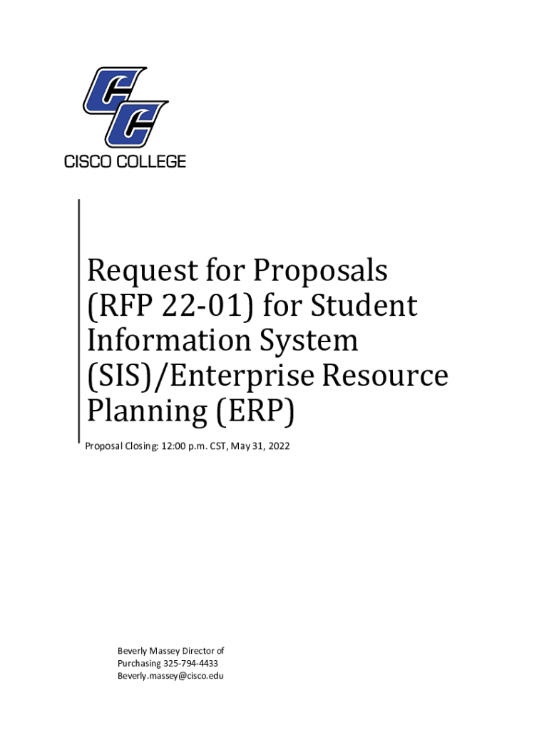 Request for Proposals (RFP 2201) for Student Information System (SIS)/Enterprise Resource Planning (ERP)Proposal Closing: 12:00 p.m. CST, May 31, 2022Beverly Massey Director of Purchasing 3257944433