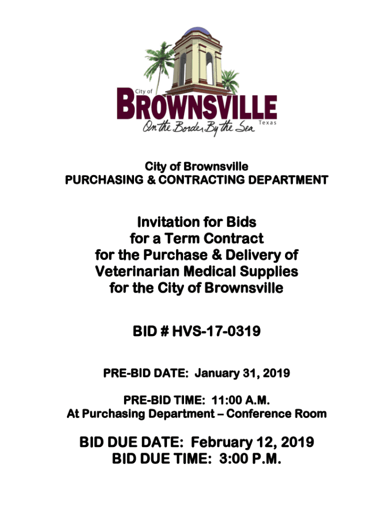 City of Brownsville PURCHASING & CONTRACTING DEPARTMENTInvitation for Bids for a Term Contract for the Purchase & Delivery of Veterinarian Medical Supplies for the City of Brownsville BID # HVS170319