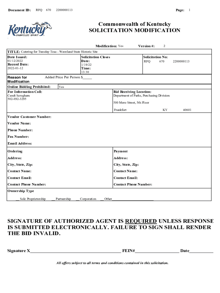 Document ID:RFQ6702200000113Page:1Commonwealth of Kentucky SOLICITATION MODIFICATION: Reversion #:TITLE: Catering for Tuesday Teas Waveband State Historic Site Date Issued: Solicitation Closes 01/12/2022