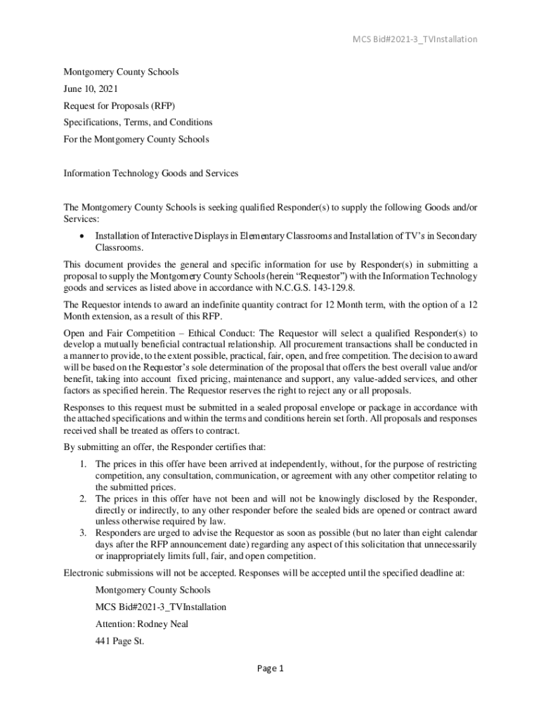 MCS Bid#20213_Installation Montgomery County Schools June 10, 2021, Request for Proposals (RFP) Specifications, Terms, and Conditions For the Montgomery County Schools Information Technology Goods