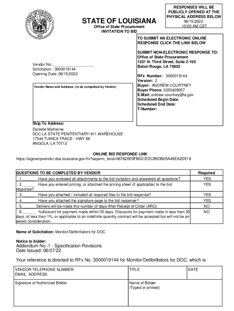 STATE OF LOUISIANA Office of State Procurement INVITATION TO RESPONSES WILL BE PUBLICLY OPENED AT THE PHYSICAL ADDRESS BELOW 06/15/2022 10:00 AM CS TTO SUBMIT AN ELECTRONIC ONLINE RESPONSE CLICK THE