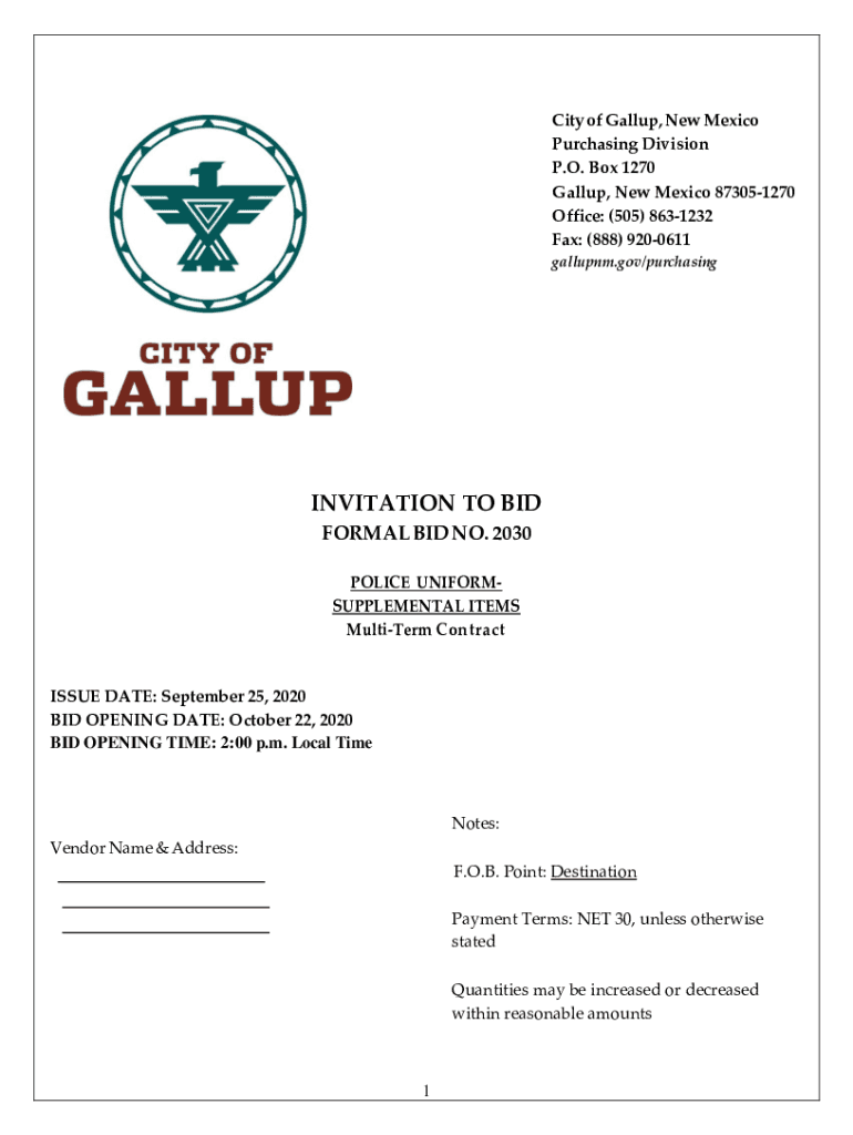 City of Gallup, New Mexico Purchasing Division P.O. Box 1270 Gallup, New Mexico 873051270 Office: (505) 8631232 Fax: (888) 9200611 gallupnm.gov/purchasingINVITATION TO BID FORMAL BID NO. 2030 POLICE