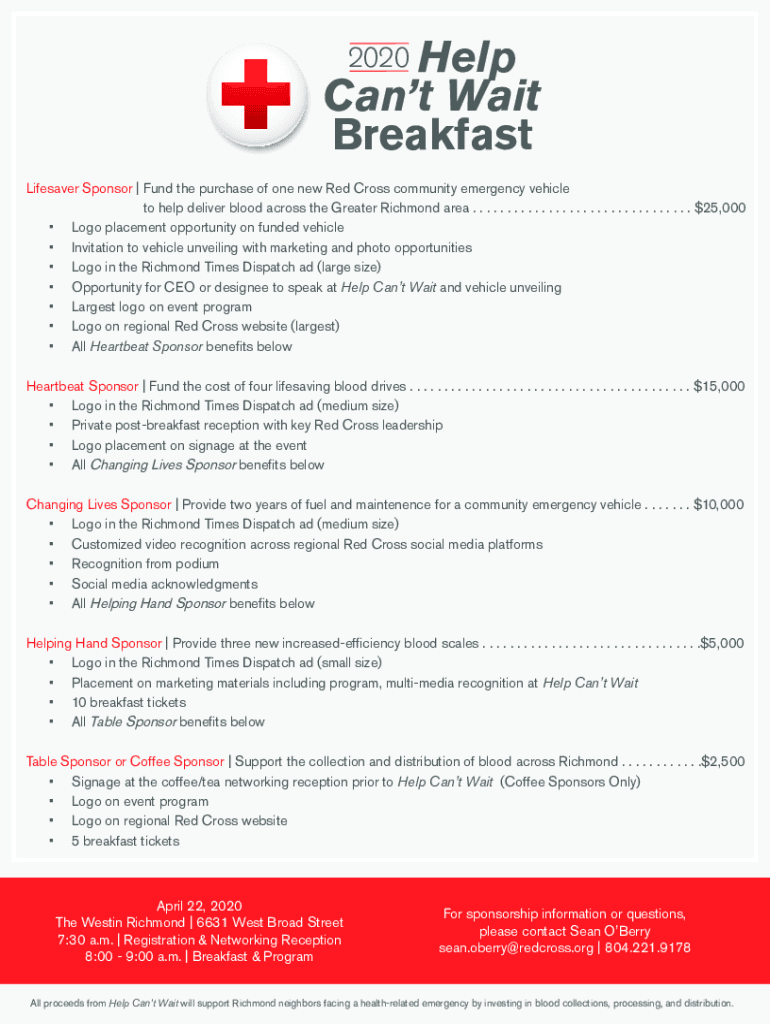 Help Cant Wait Breakfast 2020Lifesaver Sponsor | Fund the purchase of one new Red Cross community emergency vehicle to help deliver blood across the Greater Richmond area. . . . . . . . . . . . .