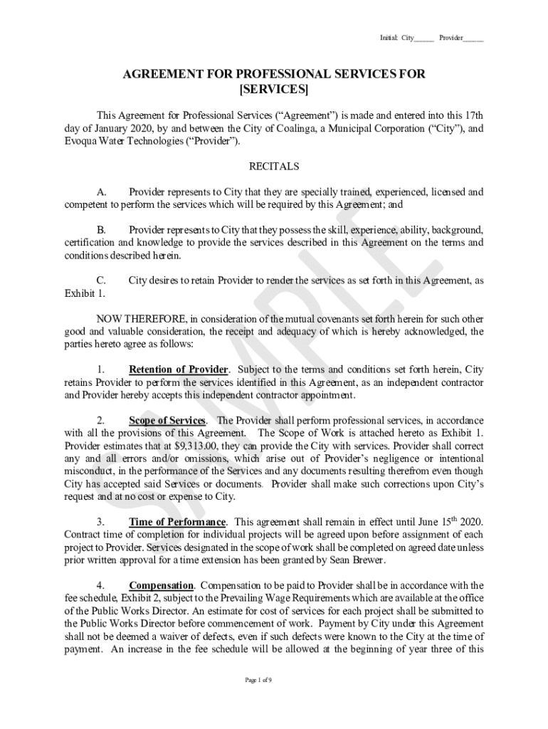 Initial: City___ Provider___AGREEMENT FOR PROFESSIONAL SERVICES FOR [SERVICES] This Agreement for Professional Services (Agreement) is made and entered into this 17th day of January 2020, by and between