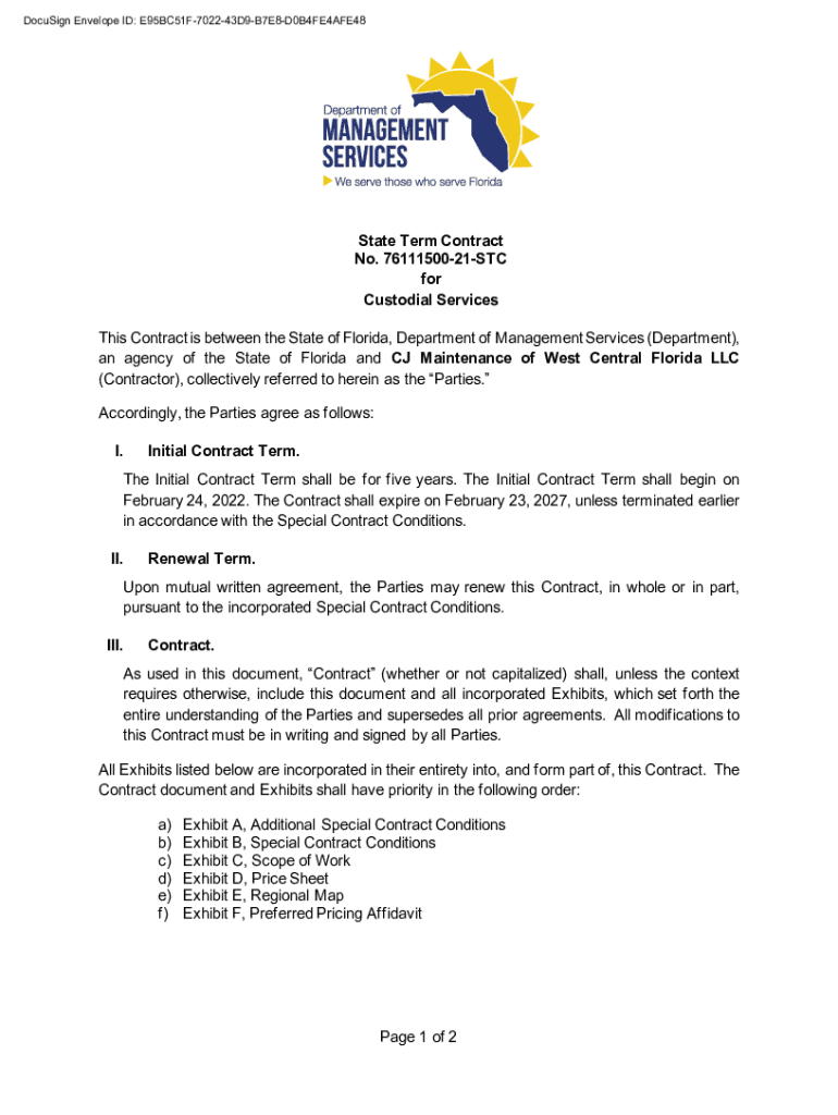 DocuSign Envelope ID: E95BC51F702243D9B7E8D0B4FE4AFE48State Term Contract No. 7611150021STC for Custodial Services This Contract is between the State of Florida, Department of Management Services
