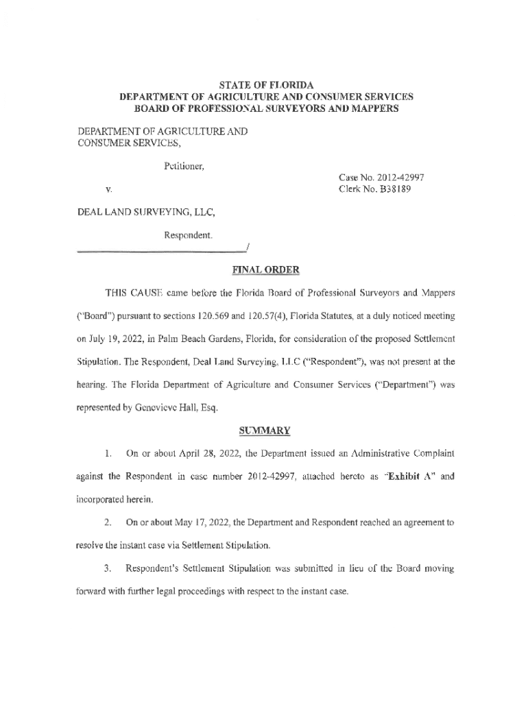 STATE OF FLORIDA DEPARTMENT OF AGRICULTURE AND CONSUMER SERVICES BOARD OF PROFESSIONAL SURVEYORS ANDMAPPERSDEPARTMENT OF AGRICULTURE AND CONSUMER SERVICES, Petitioner, Case No. 201242997 Clerk No.