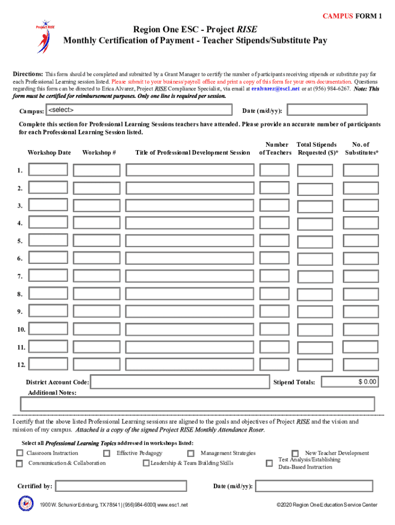CAMPUS FORM 1Region One ESC Project RISE Monthly Certification of Payment Teacher Stipends/Substitute Preset Form Print Submit by EmailDirections: This form should be completed and submitted by a