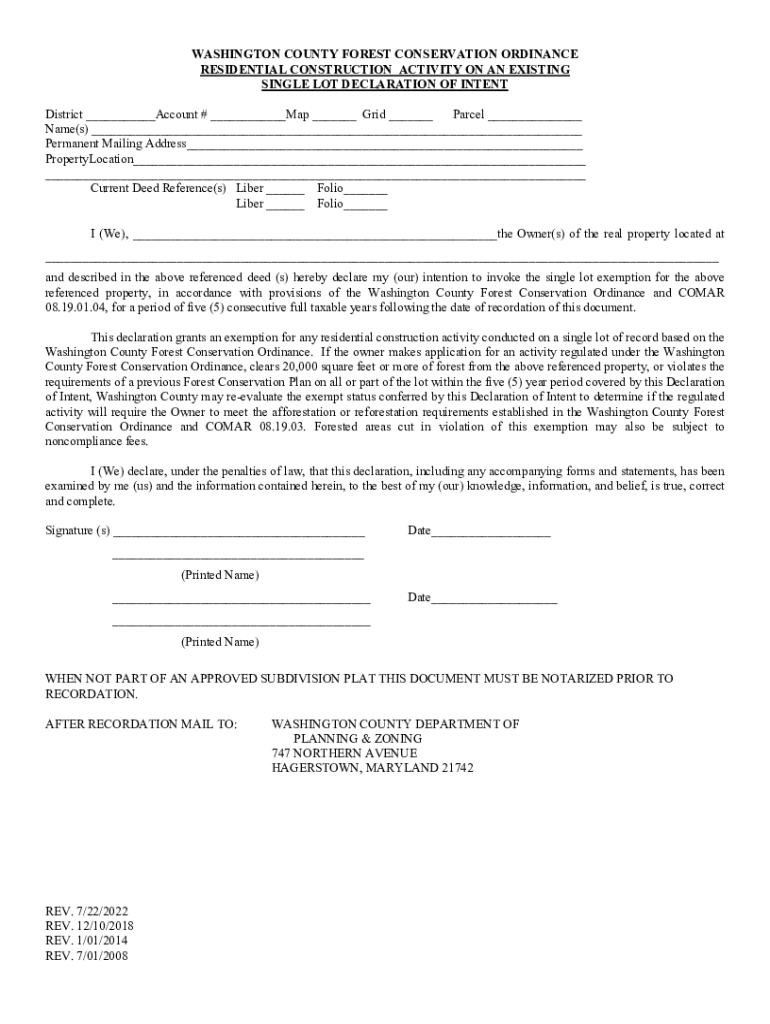 WASHINGTON COUNTY FOREST CONSERVATION ORDINANCE RESIDENTIAL CONSTRUCTION ACTIVITY ON AN EXISTING SINGLE LOT DECLARATION OF INTENT District ___Account # ___Map ___ Grid ___ Parcel ___ Name(s) ___ Permanent