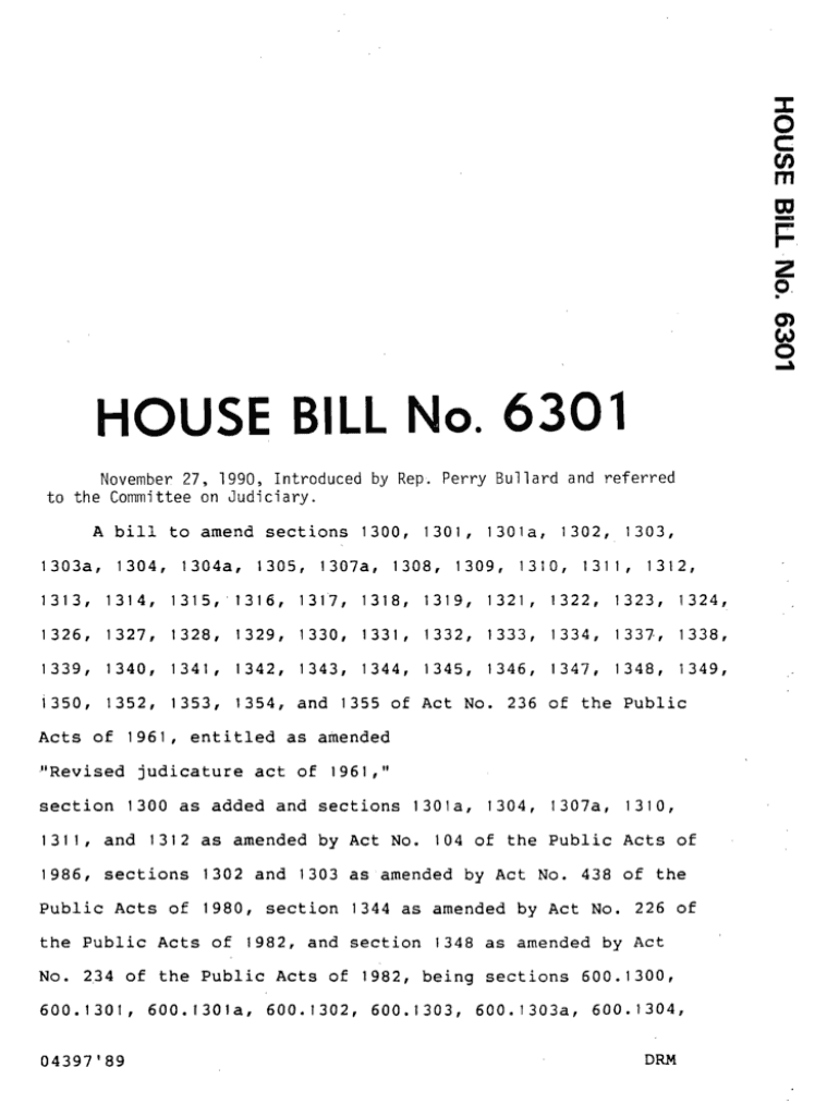 HOUSE BILL No. 6301HOUSE BILL No. 6301 November 27, 1990, Introduced by Rep. Perry Ballard and referred to the Committee on Judiciary. A bill to amend sections 1300, 1303a,1304,1304a,1305,1307a,1301,1308,1301a,1309,1302,1310,1303,1311,1312,1313,1314,