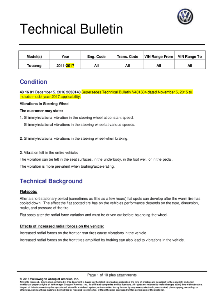 Technical Bulletin Model(s)Year Eng. Comedians. CODEVI Range From VIN Range ToTouareg20112017AllAllAllAllCondition 48 16 01 December 5, 2016 2038140 Supersedes Technical Bulletin V481504 dated November